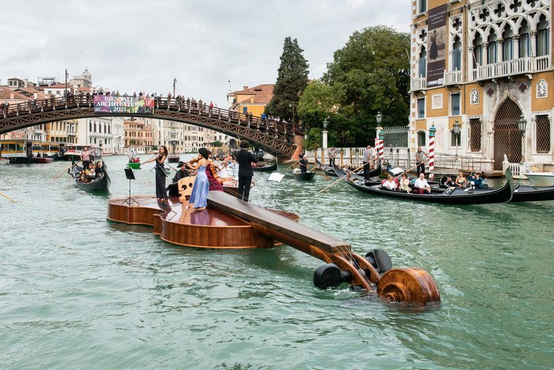 O violino gigante navegou pelo Grand Canal até perto da Ponte de Rialto, levando um quarteto de cordas que tocava as Quatro Estações, do veneziano Vivaldi
