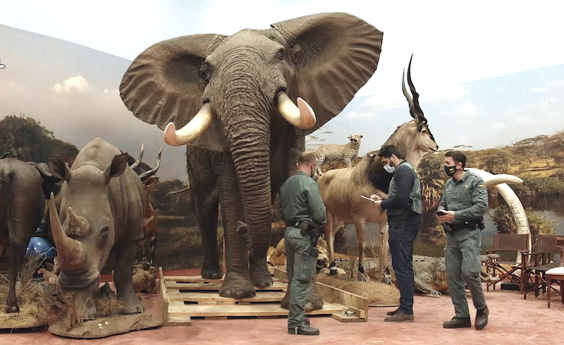 Elefantes, leões e rinocerontes estão entre os animais empalhados da coleção confiscada pela polícia espanhola e avaliada em R$ 150 milhões, que inclui espécies extintas.
